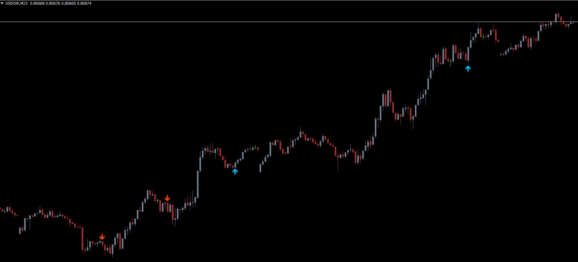 The deep sky blue arrows appear after a two-bar bullish reversal, indicating a strong buying opportunity.