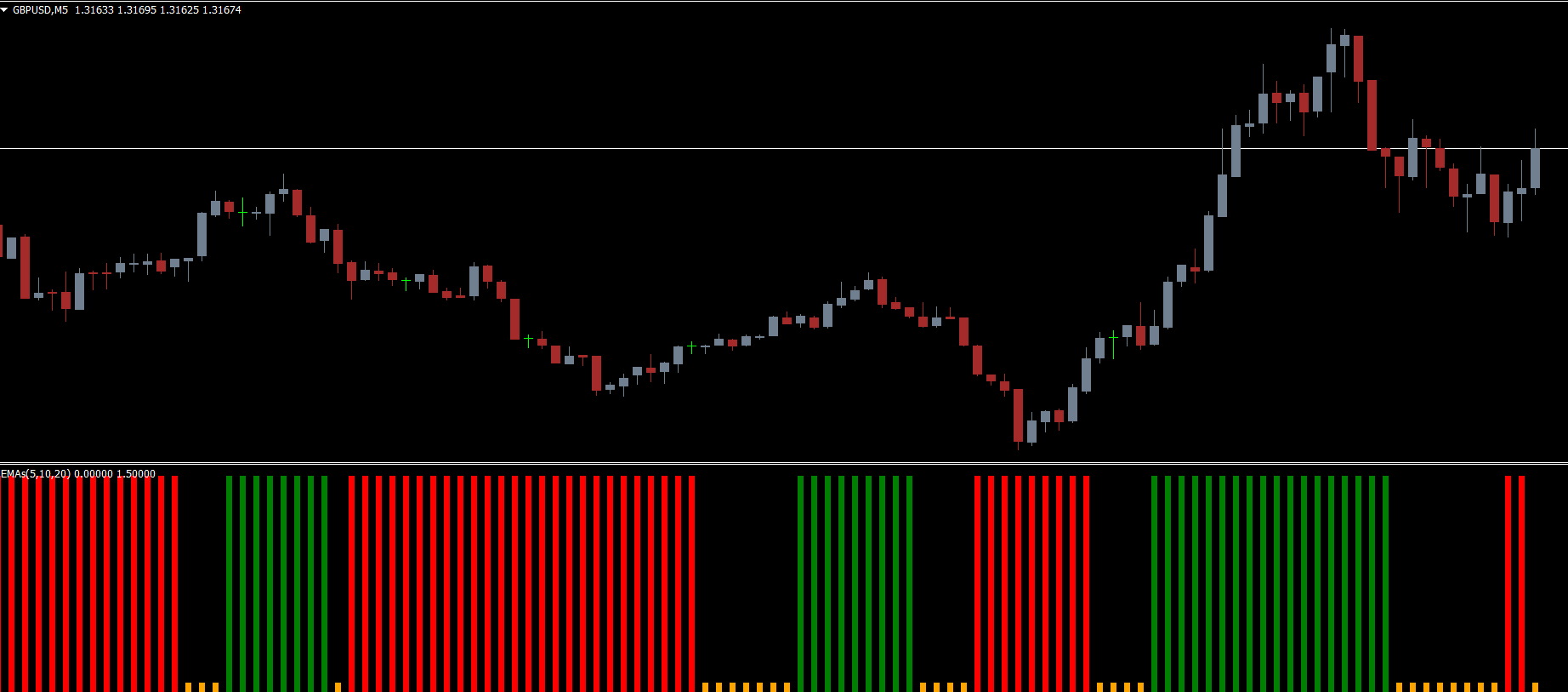 The 3 EMA Crossover Indicator uses histogram bars to visualize the market trend: