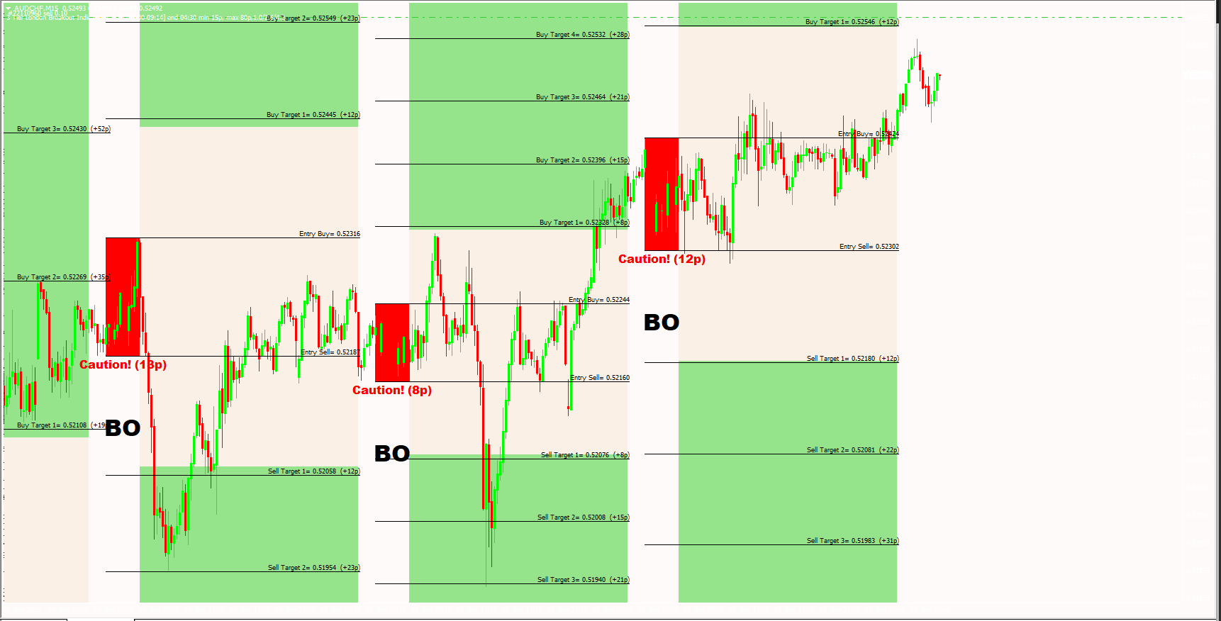 Breakout (BO) Labels: Indicate the expected breakout points and the number of pips until breakout.