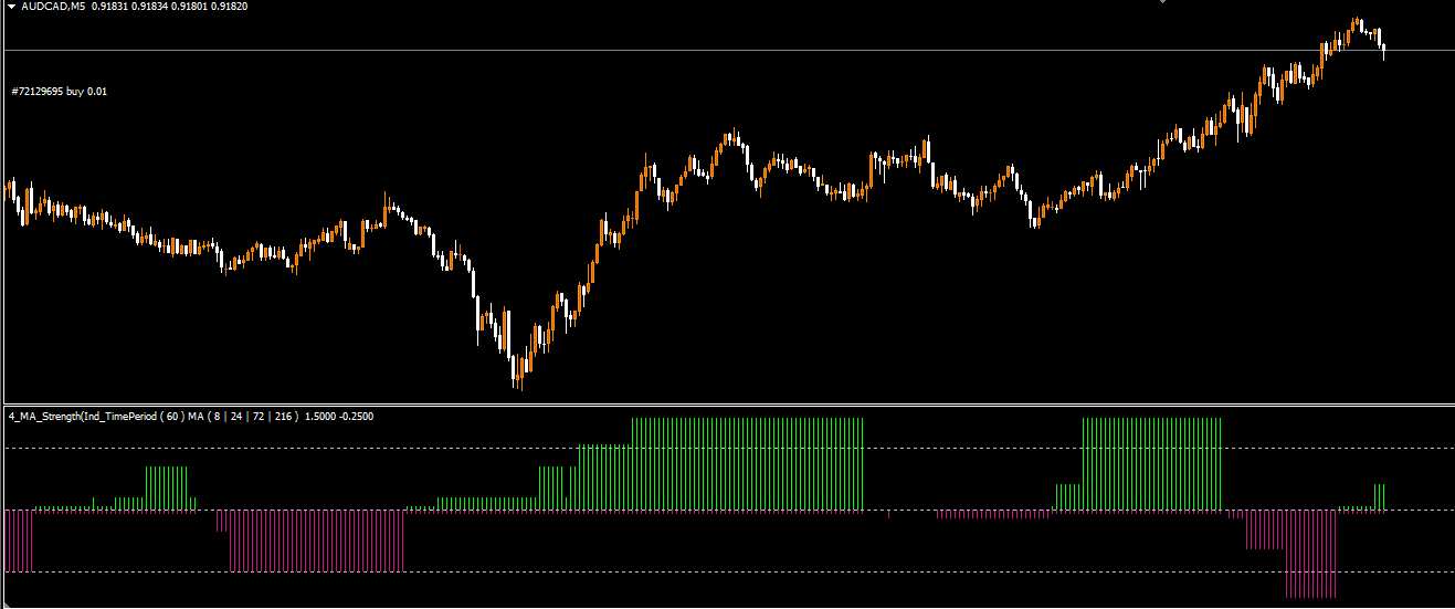 This combination of simplicity and accuracy makes the 4-MA Strength Indicator ideal for traders who prefer visual, data-driven setups.