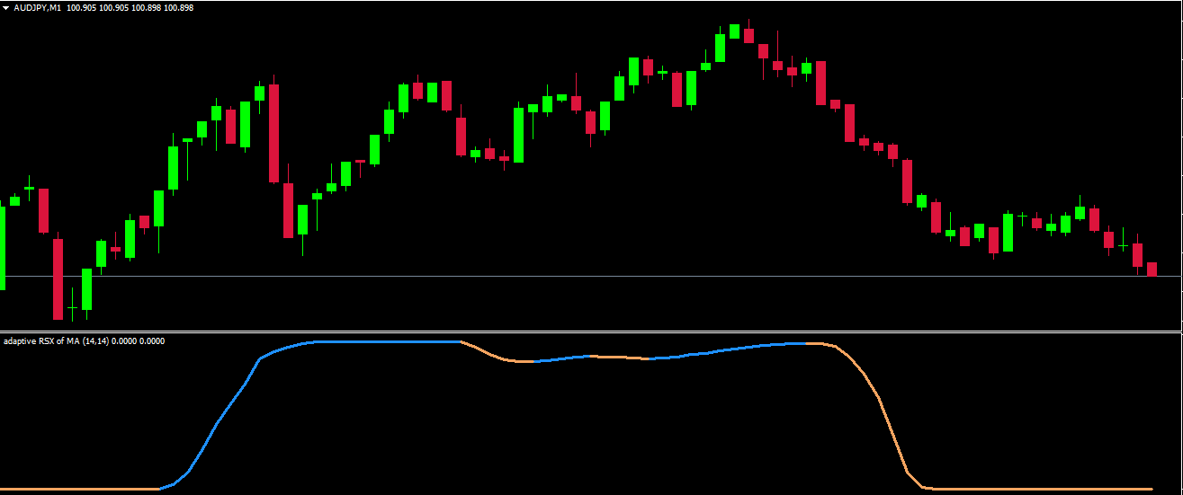Apply the Adaptive RSX of MA to your MT4 chart. When the indicator turns blue, it signifies a bullish market phase. In contrast, when the line turns brown, it signals bearish momentum.