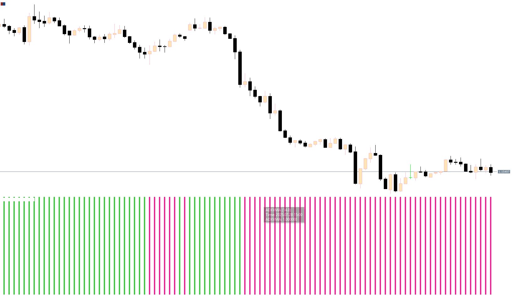 Traders can open positions as soon as the histogram changes color and exit when it signals the opposite trend. For optimal performance, the ADX line should be observed to confirm trend strength and identify early exit points.