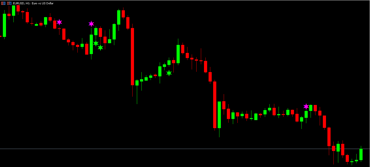 When a purple star appears, it’s a signal to go short (sell). Place your stop-loss above the previous swing high.