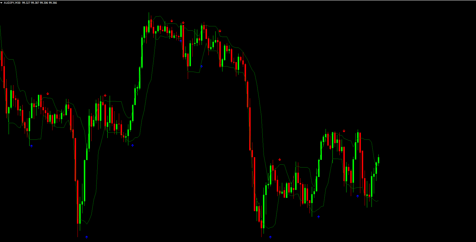 Red Arrow (Down): A sell signal, triggered when price breaks below the lower line with momentum.