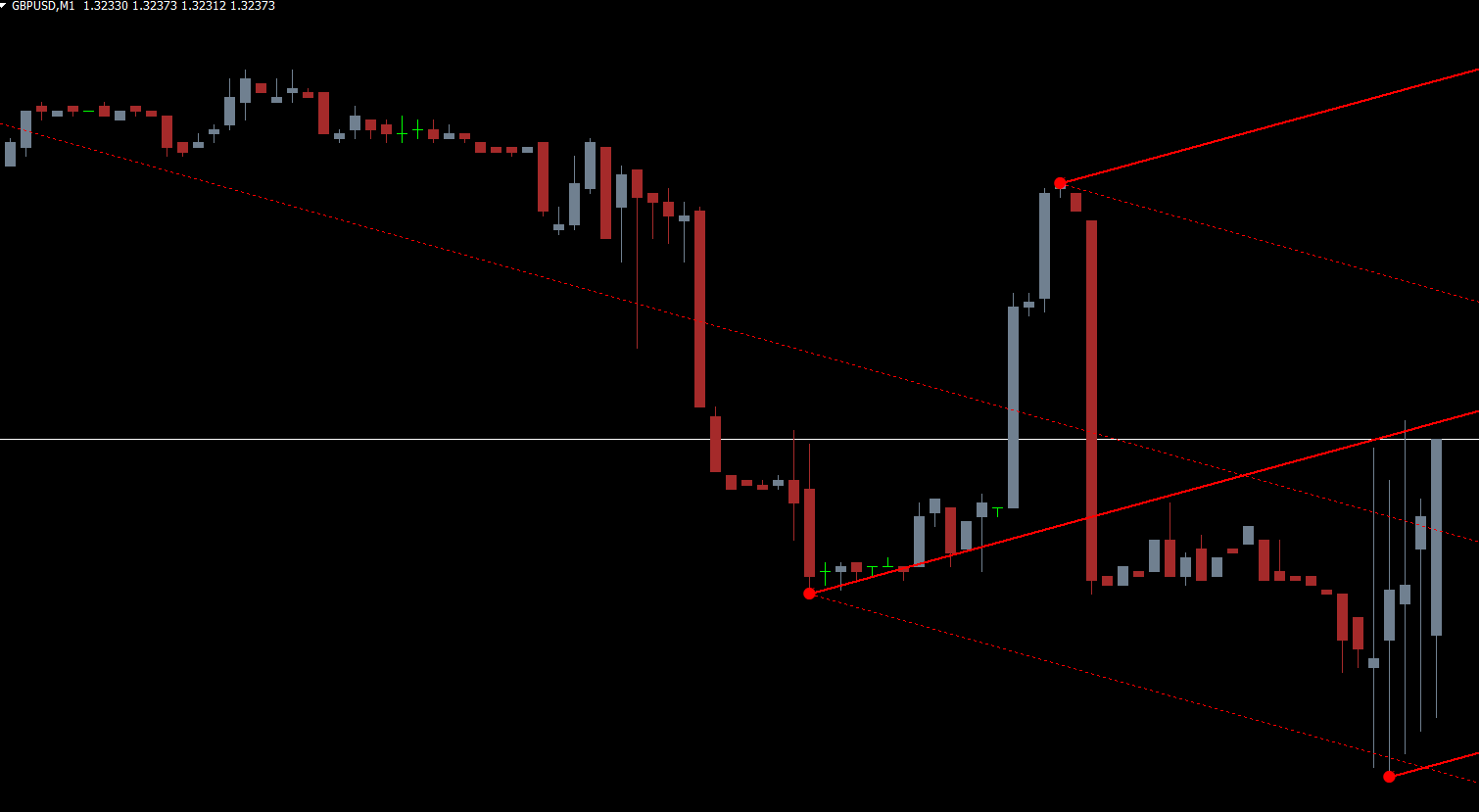 When applied to an MT4 chart, the indicator marks extreme points in red. Pitchforks built using older, confirmed extremes appear with dotted lines and do not redraw. However, the pitchfork based on the most recent point (solid lines) may adjust slightly as new market extremes form.