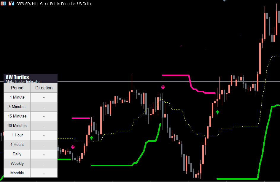 The AW Turtles Indicator identifies breakout levels and plots them directly on your chart. These levels act as visual guides to determine the trend direction and ideal entry or exit points.