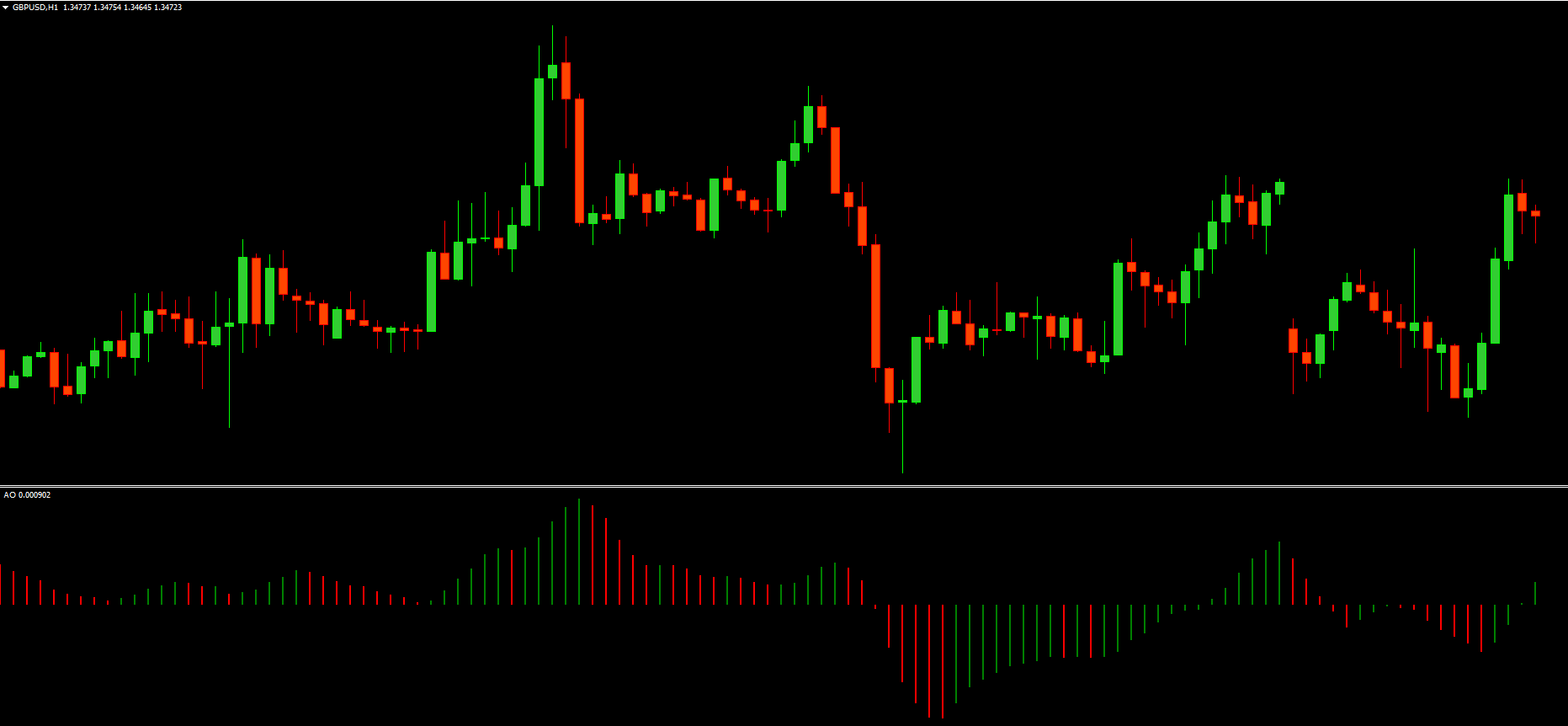 The Awesome Oscillator (AO) reflects market momentum through green and red histogram bars that move above and below the zero line.