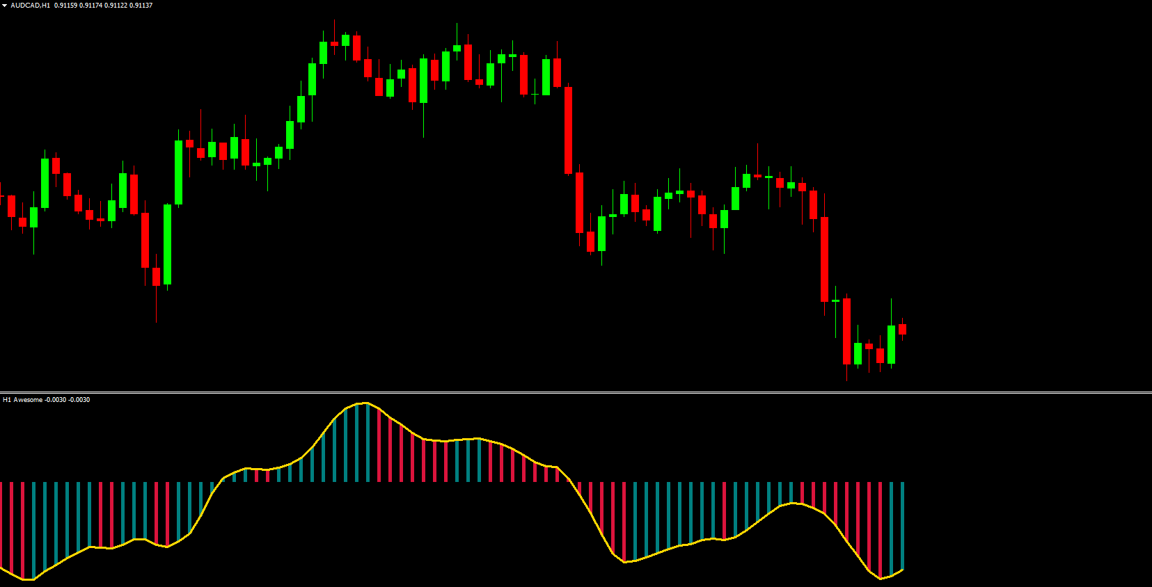 The indicator displays teal and crimson histogram bars to represent positive or negative momentum: