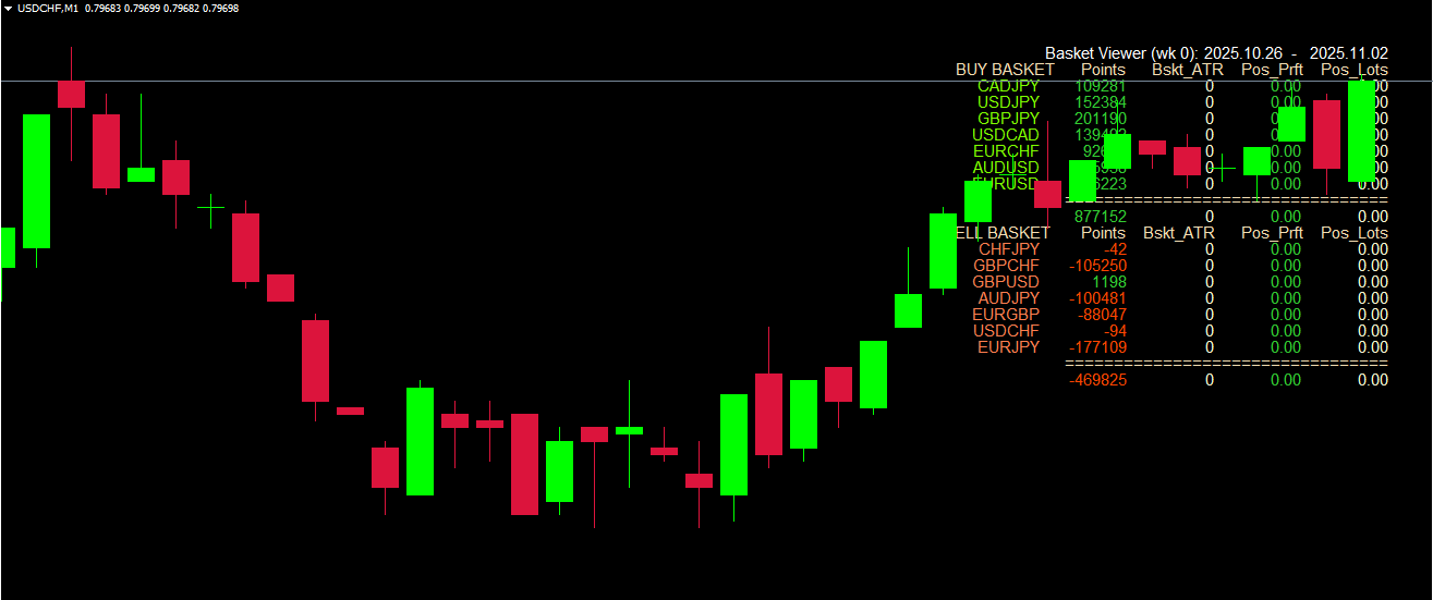 The indicator separates buy and sell baskets for easier interpretation. You can quickly assess total exposure, individual profits, and the overall balance of your trading portfolio.