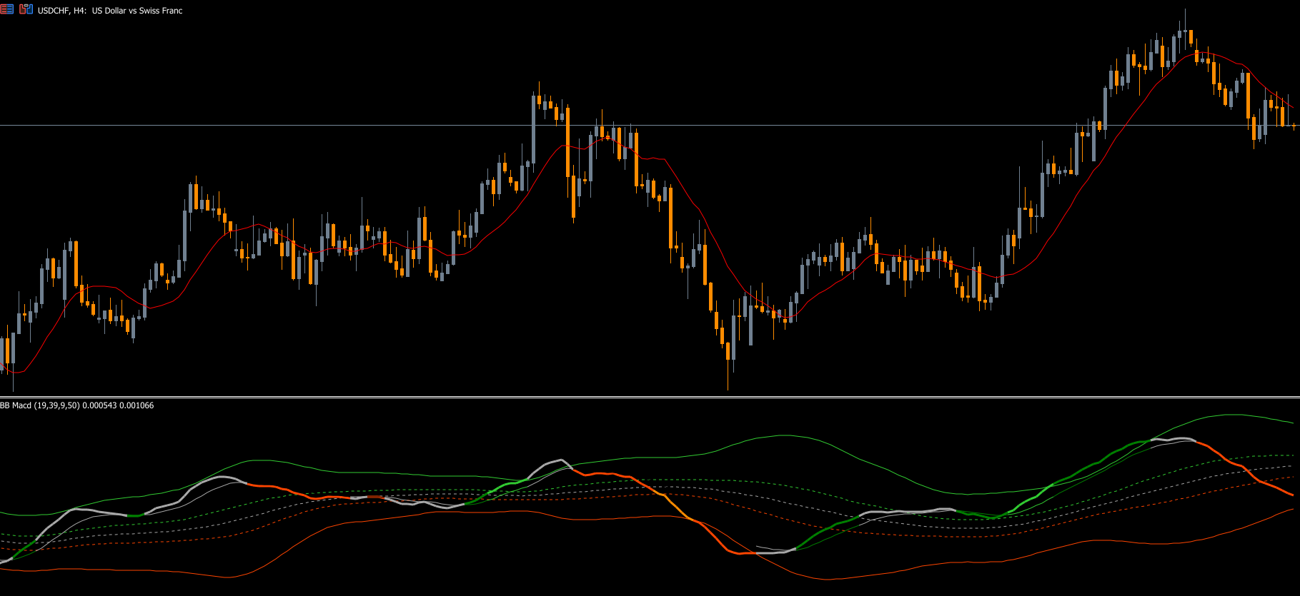 The BB MACD Indicator plots: