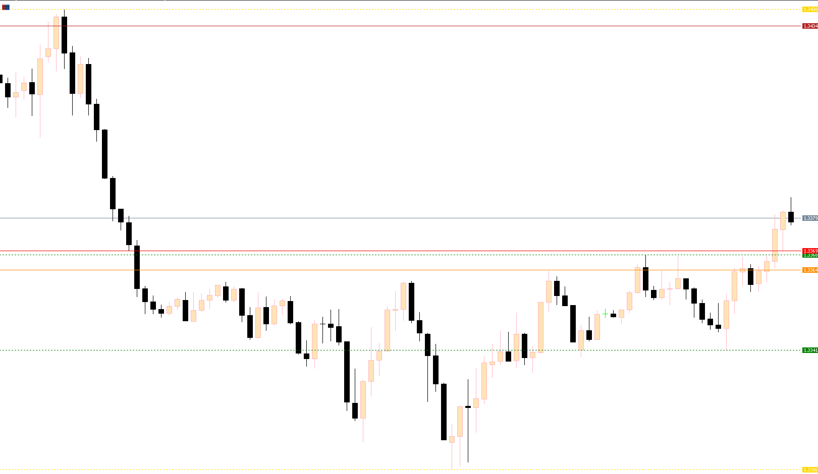Resistance Levels: Shown as red dotted lines, marking zones where sellers control the market.