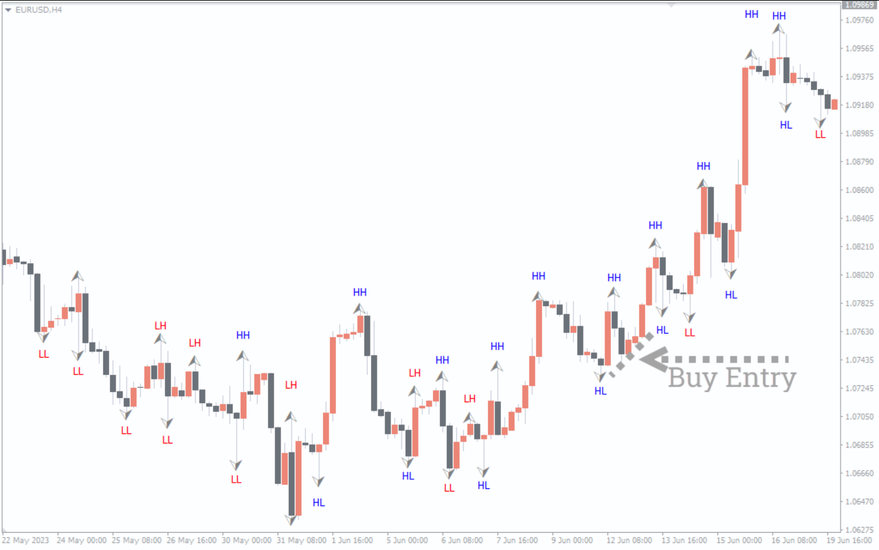The indicator plots Higher Highs (HH) in blue and Lower Lows (LL) in red on your MT4 chart. This allows traders to instantly see the trend bias and trade accordingly.