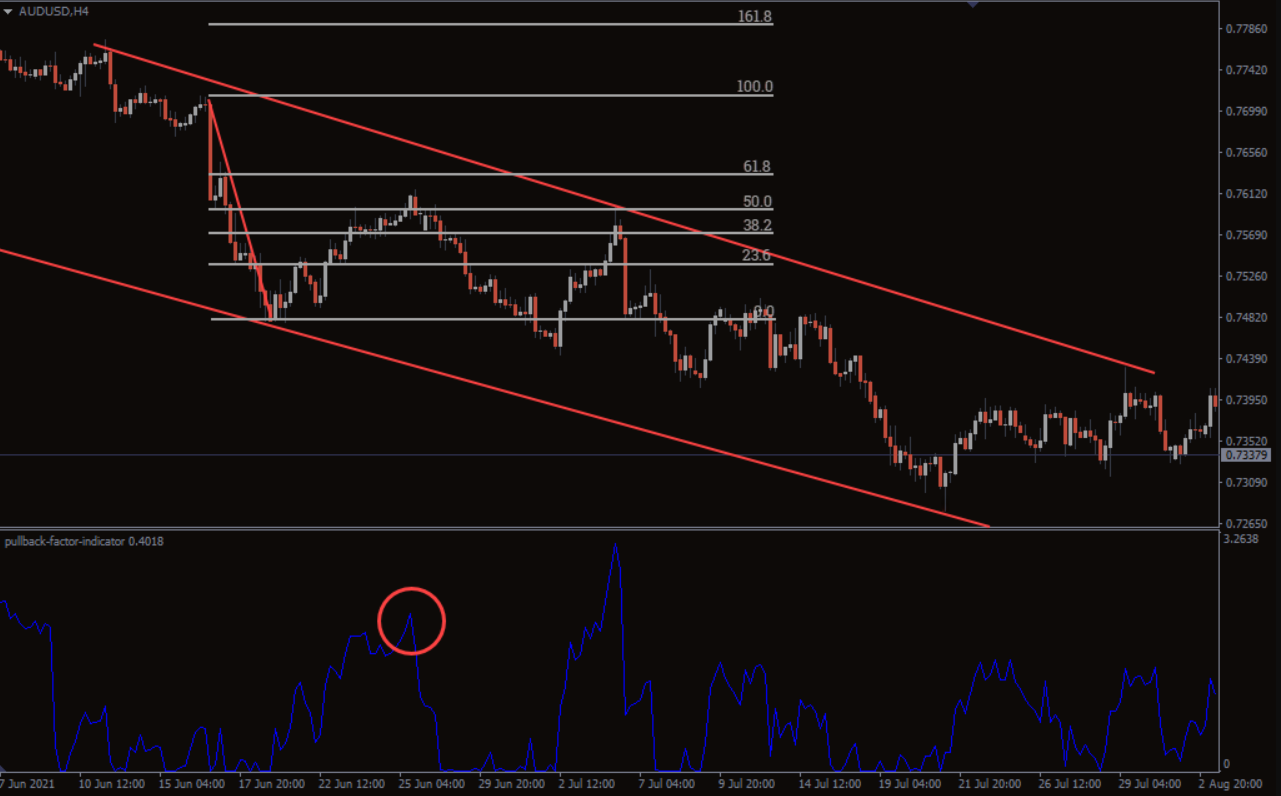 For instance, on an AUD/USD H4 chart, the market was in a downtrend. Price retraced to the 61.8% Fibonacci level. When the Pullback Factor Indicator reached 1.9, it signaled the end of the retracement. A bearish engulfing candle confirmed the continuation of the downtrend. Traders could enter a sell position with low risk and a favorable risk-to-reward ratio.