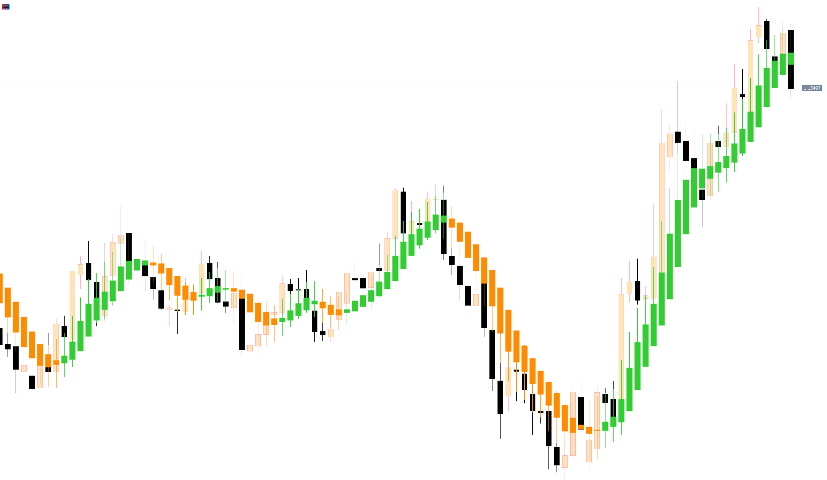 When Heiken Ashi candles turn orange, it signals a bearish trend.