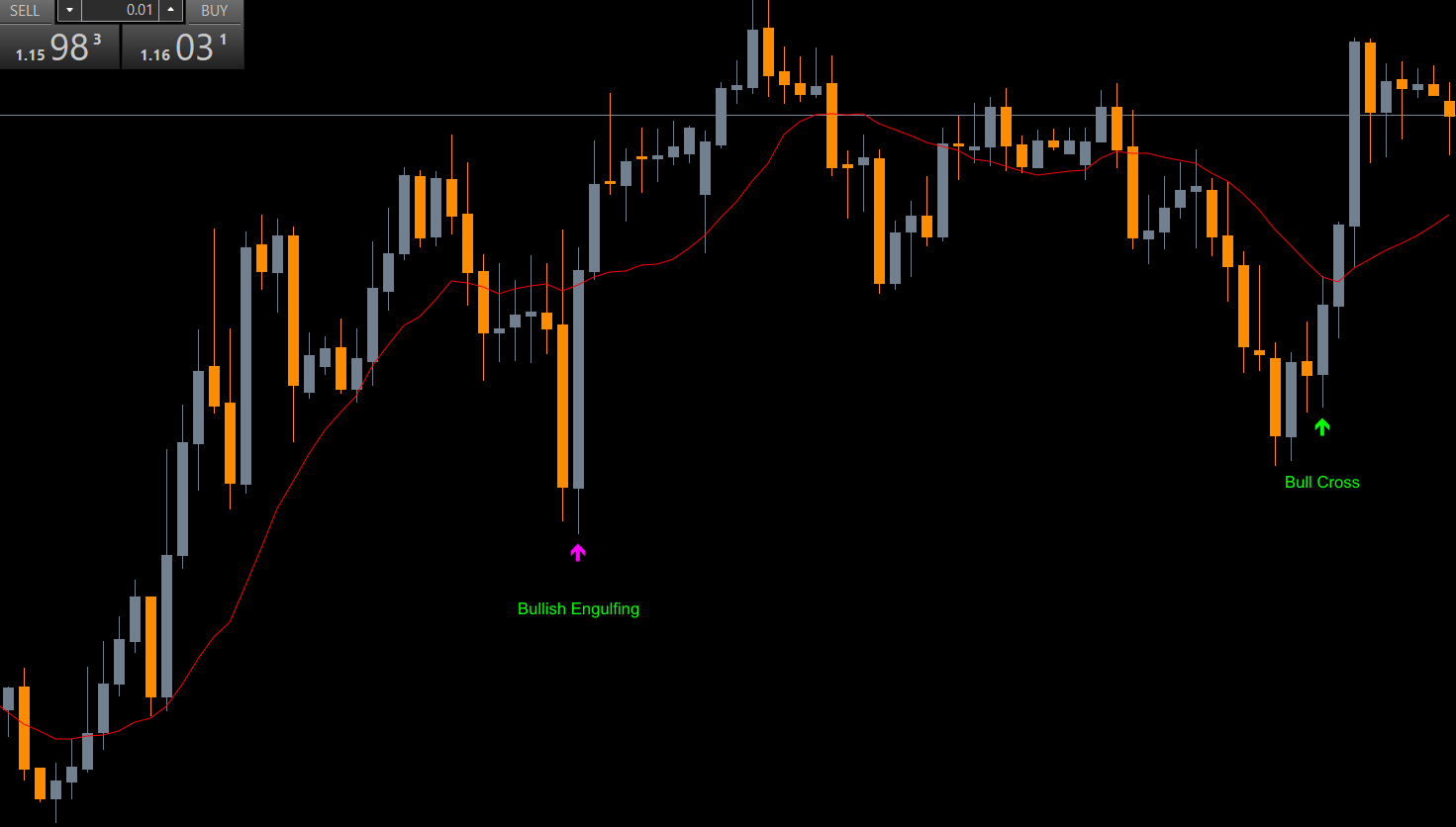 The indicator provides a broader view of market structure, allowing traders to make informed decisions. For example, a bullish engulfing pattern indicates a potential strong upward move, while a bearish engulfing signals a likely downward trend.