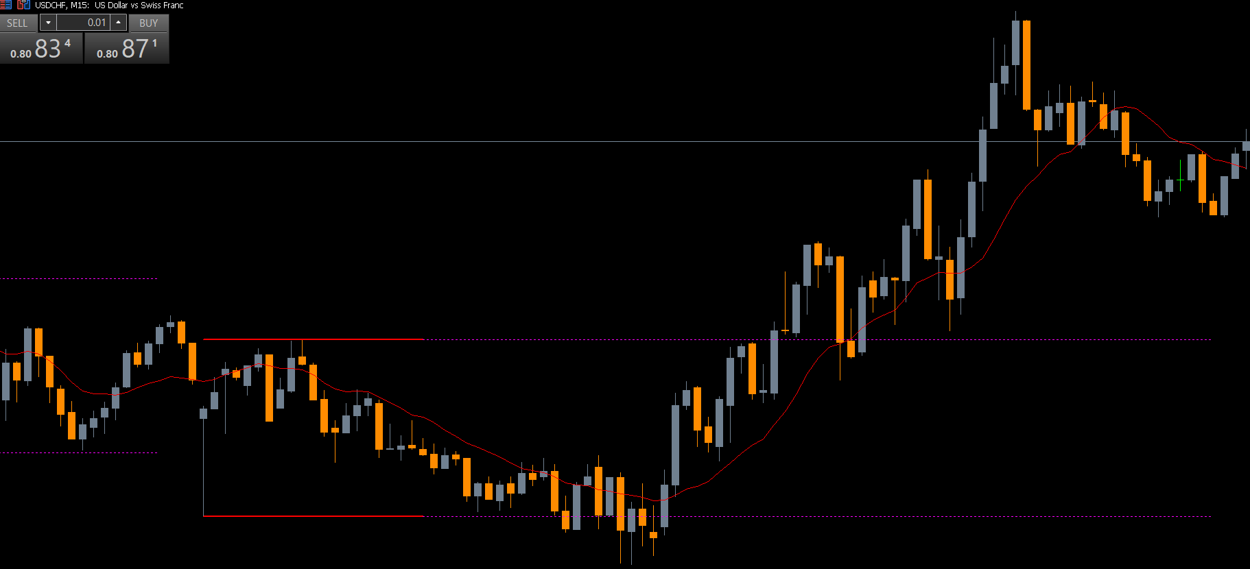 Observe the red bands drawn by the indicator to highlight the breakout zone.