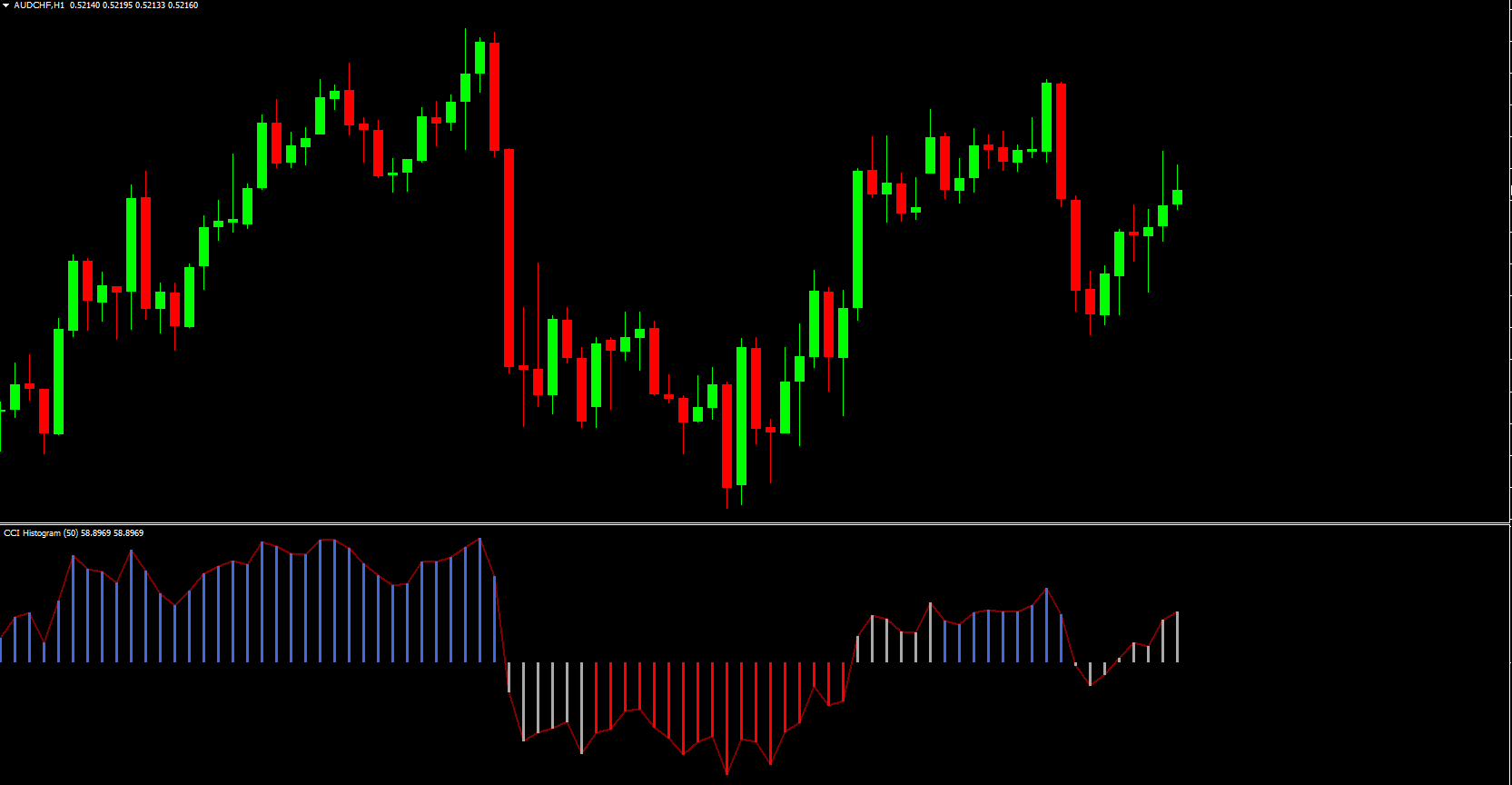 The CCI Histogram Indicator for MT4 displays market trends using distinct colors: