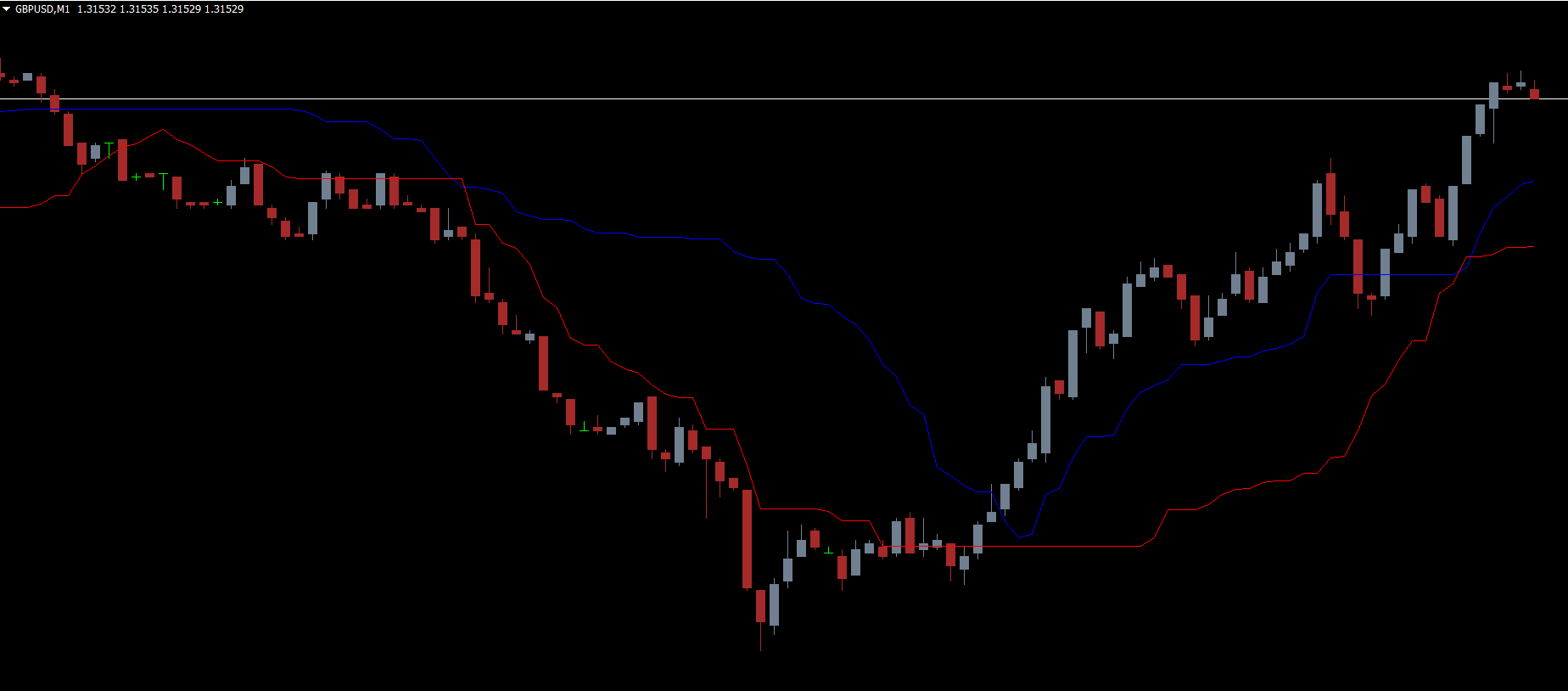 For exit management, long trades should be closed when the price falls below the blue line. Short trades should be closed when the price rises above the red line. This trailing stop behavior protects profits and prevents premature exits during consolidation.