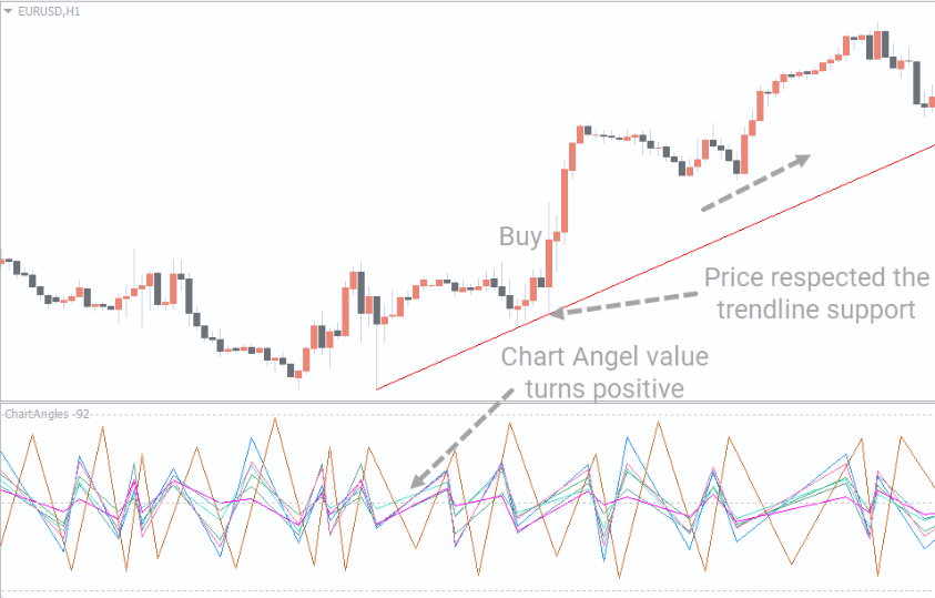 Imagine analyzing the EUR/USD chart where the price rejects a trendline support. The Chart Angles V3 Indicator then displays a positive chart angle value with the blue line crossing above the green zigzag. This combination suggests a strong trend-following buy signal — perfect for traders who prefer momentum-based entries.