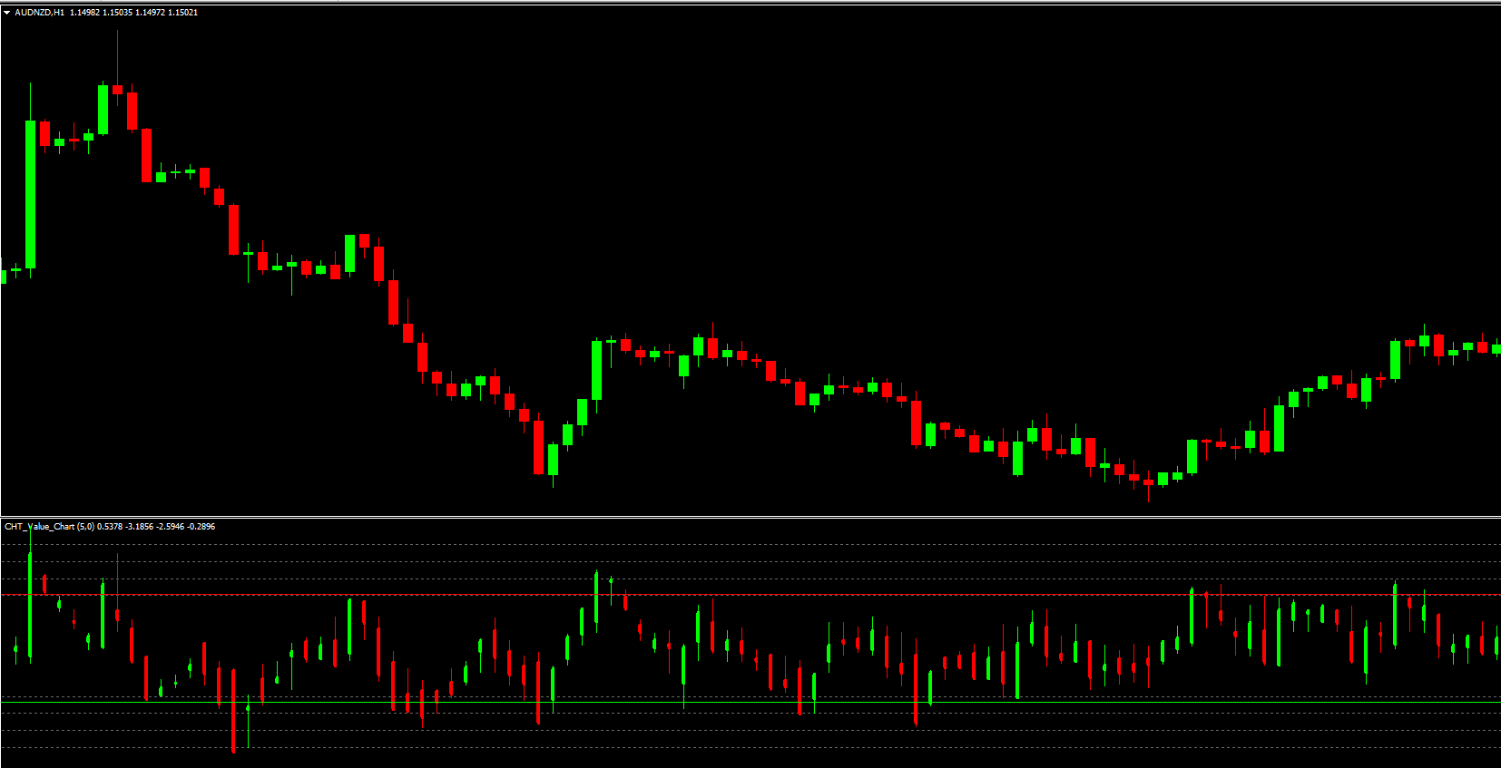 The CHT Value Chart V2.5.3 indicator for MT4 is a powerful custom oscillator that plots a value chart in a separate window. It displays green and red candles, along with clearly defined overbought and oversold levels. When the value chart touches these levels, forex traders can anticipate potential price reversals and identify ideal entry points for buy or sell trades.