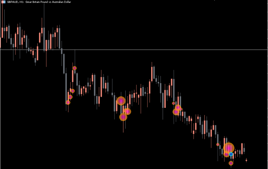 The Cluster Indicator MT5 measures tick volume within a specific price range and time period. It then highlights these areas with vibrant clusters — the larger and more colorful the circle, the higher the trading activity.
