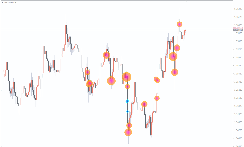 The Cluster Indicator analyzes historical data and identifies price levels with trading volume above a set threshold. When such levels are detected, circles of varying size and color are plotted directly on the chart: