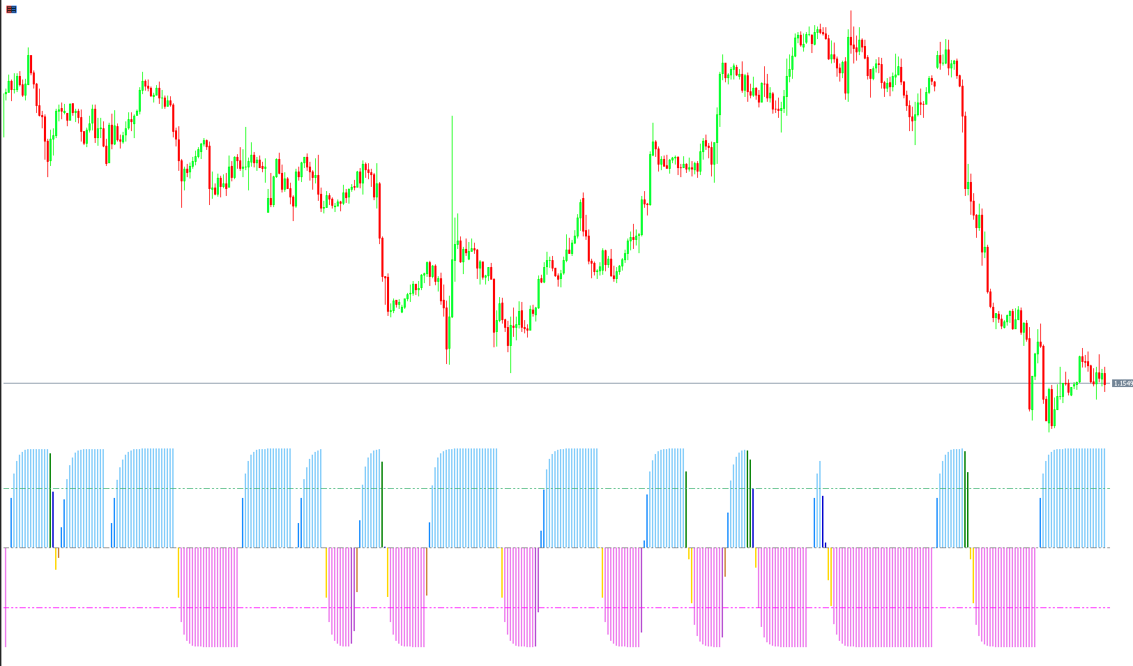 When the oscillator moves near -105 and turns blue, it suggests that the market is oversold and may start moving upward.