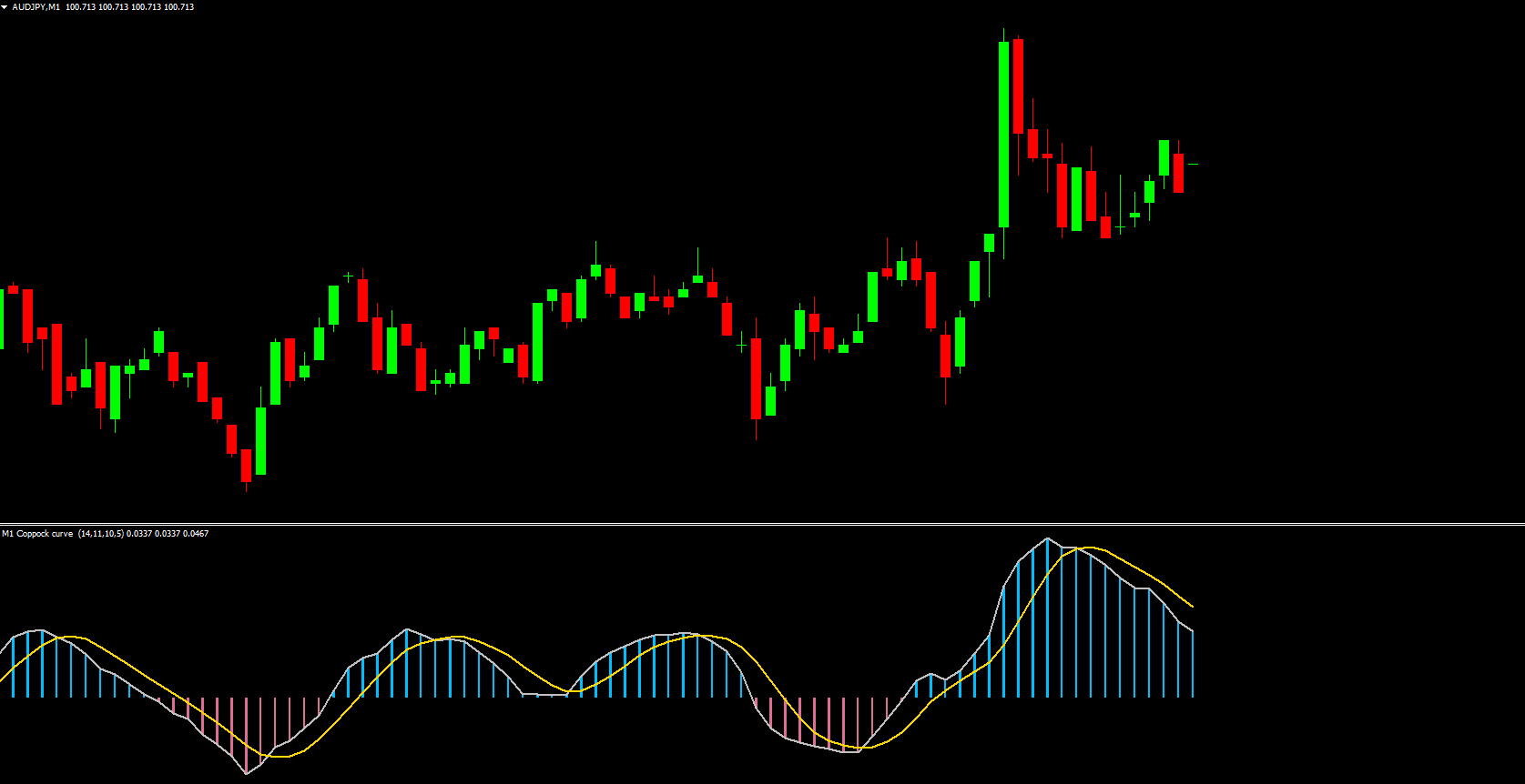 When the Coppock Curve crosses the zero level from bottom to top, it signals a potential long entry. Traditionally used for long-term positions, this signal can be adapted for intraday forex trading.