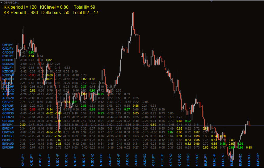 The indicator calculates correlation coefficients over various timeframes and displays them directly on the MetaTrader 4 (MT4) chart. This allows traders to visually assess which pairs are moving together and which are diverging.