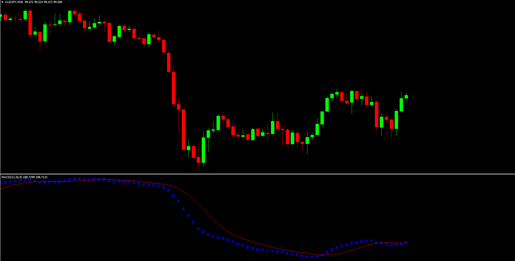 A blue MACD line that shows the momentum or strength of the current trend.
