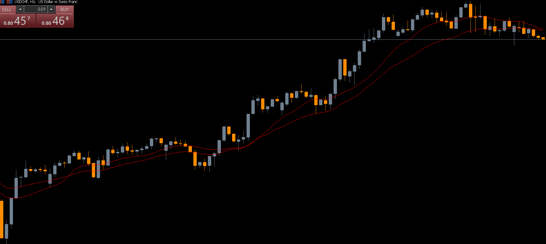 As shown in the chart example, the moving average line visually represents the trend direction. The trading approach becomes very simple: determine whether the price remains above or below the moving average.