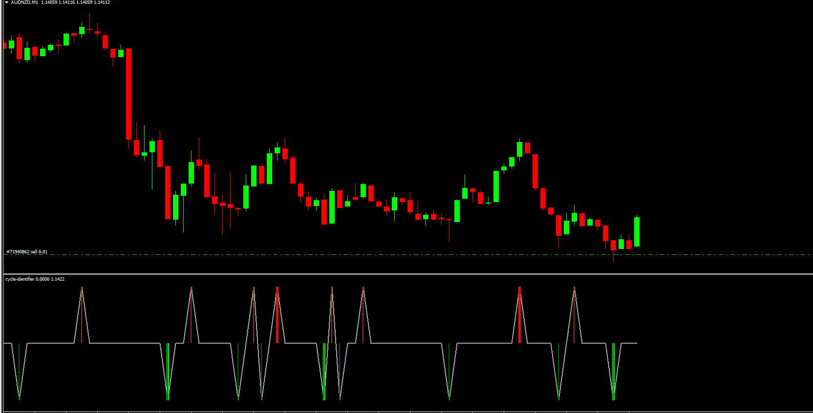 The Cycle Identifier MT4 indicator displays a separate chart below the main trading chart. On this chart, a gray oscillating line moves up and down around the 0.00 level. Spikes on the gray line are accompanied by colored bars that indicate market trend and momentum: