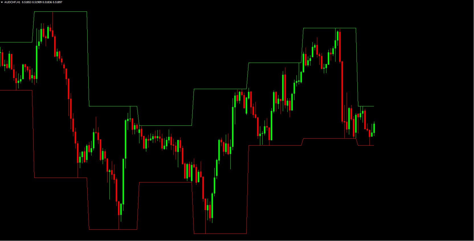 The indicator continuously plots the high in LIME and the low in RED, providing clear visual signals for key trading levels.