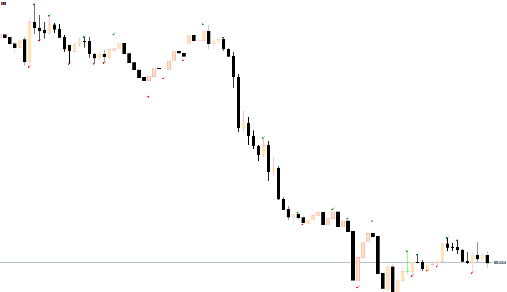 The indicator does not provide explicit buy or sell signals. Instead, it visually marks potential reversal points, helping traders anticipate trend changes.