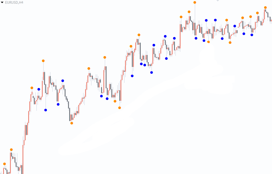 This indicator plots two types of dots—blue and orange—that serve as actionable trading signals. The blue dot represents a signal from the fast ZigZag, while the orange dot appears when both the fast and slow ZigZag align. The latter is considered stronger because it confirms a reversal across two different market sensitivities.
