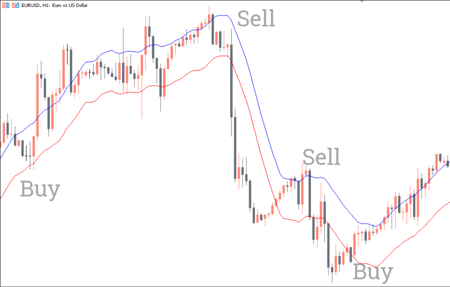 The Envelopes Indicator displays two color-coded lines—typically red and blue—that move in response to market activity.