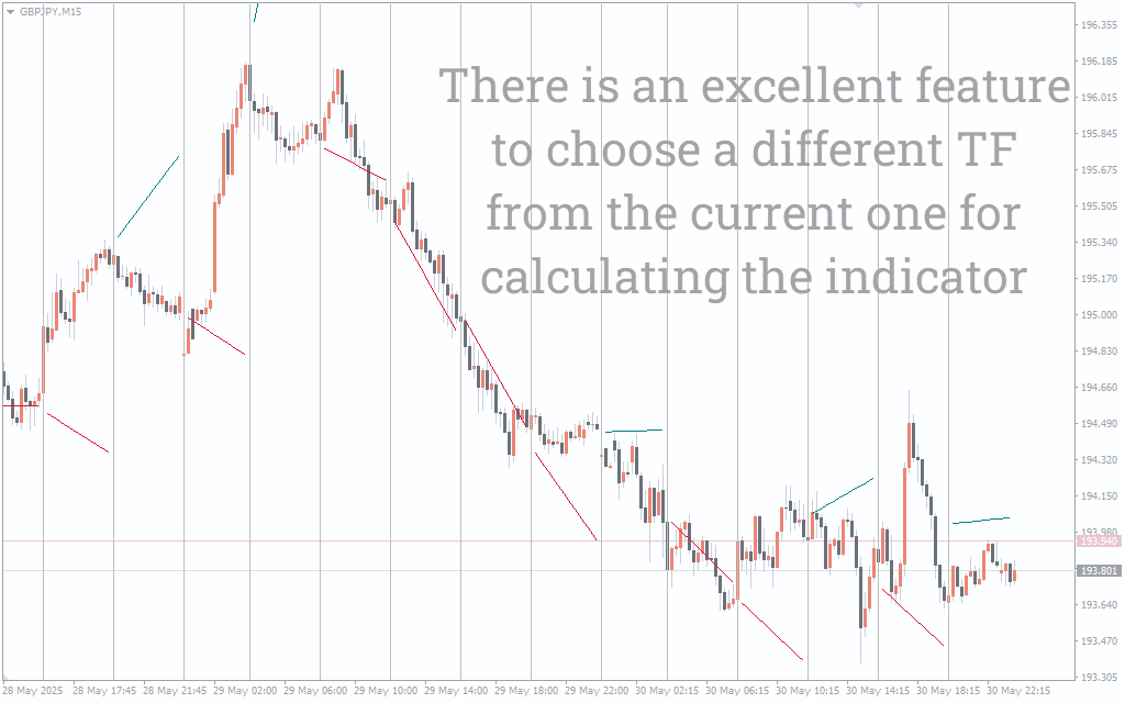 The indicator functions by analyzing the most recent daily trend direction and slope. It then extends this completed trend forward onto lower timeframes such as H1 or M15 charts. The result: forward-looking trendlines that provide immediate context for intraday decision-making.
