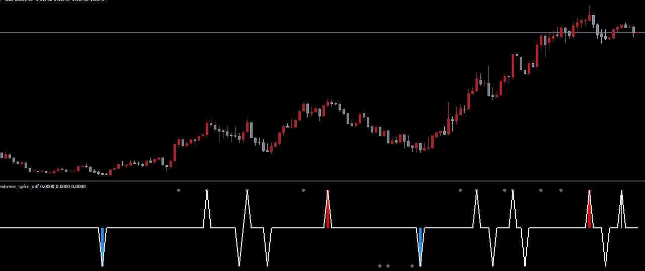 Spikes often occur at strong support and resistance levels, allowing traders to profit from sharp but brief price rallies. The Extreme Spike MTF indicator simplifies the identification of these critical market movements, which can otherwise be challenging due to their unpredictable timing.