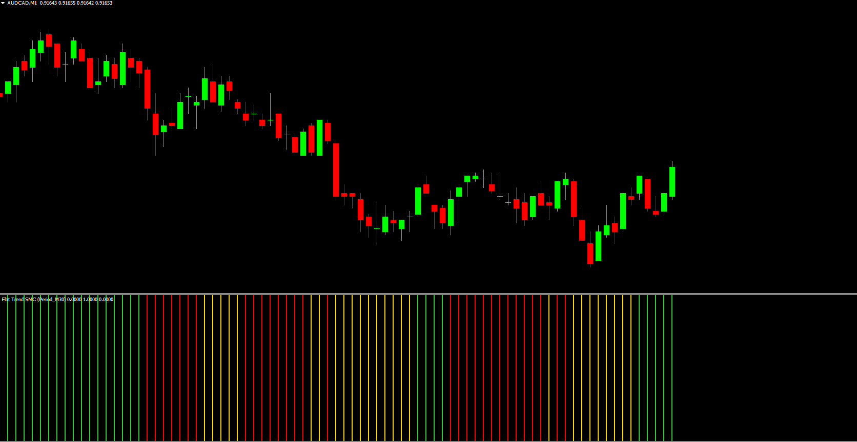 Imagine analyzing the USD/CHF chart with the Flat Trend SMC indicator applied. During periods where yellow bars appear, price consolidates. When the bars flip to green, price begins a bullish trend. Conversely, when yellow bars flip to red, price starts declining. These transitions help traders catch high-probability moves while avoiding choppy zones.