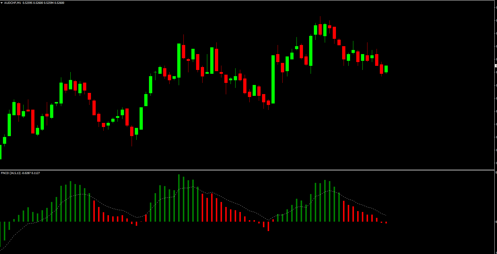 The FNCD Indicator operates in a separate window below your main MT4 chart. It uses histogram bars centered around a 0.00 level, helping traders easily visualize bullish and bearish trends: