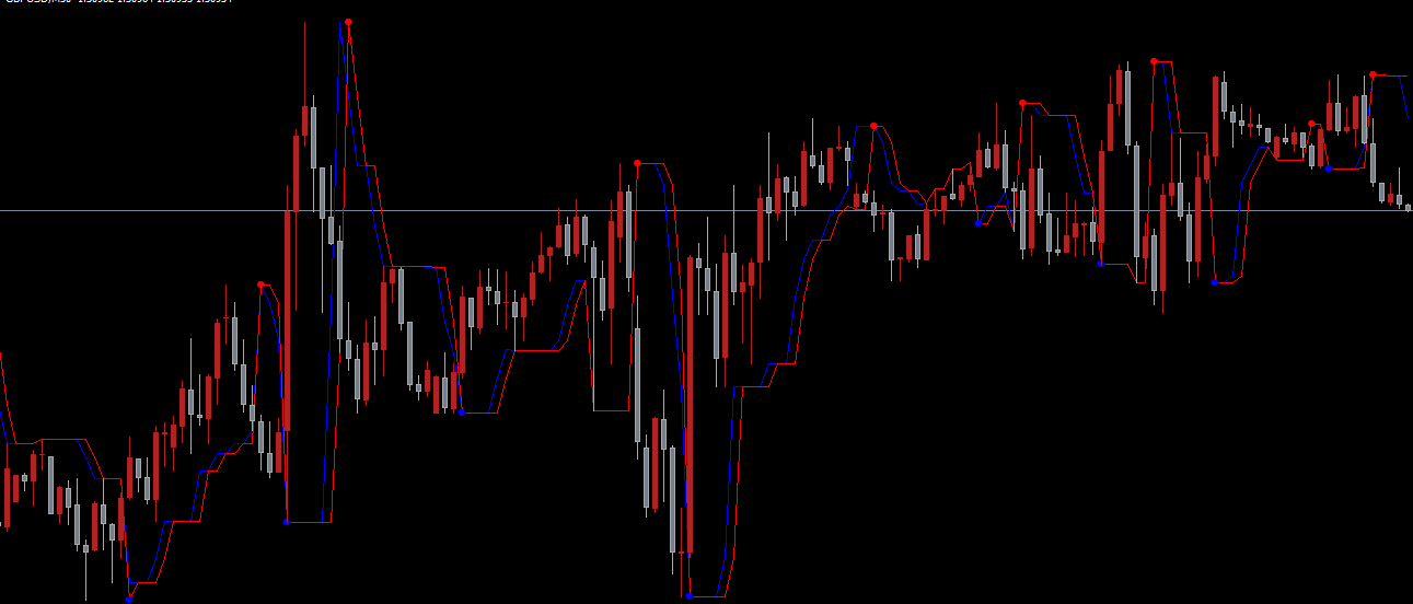 Blue Line & Dot: Indicates a bullish trend. A price above the blue line with a blue dot confirms an upward movement.