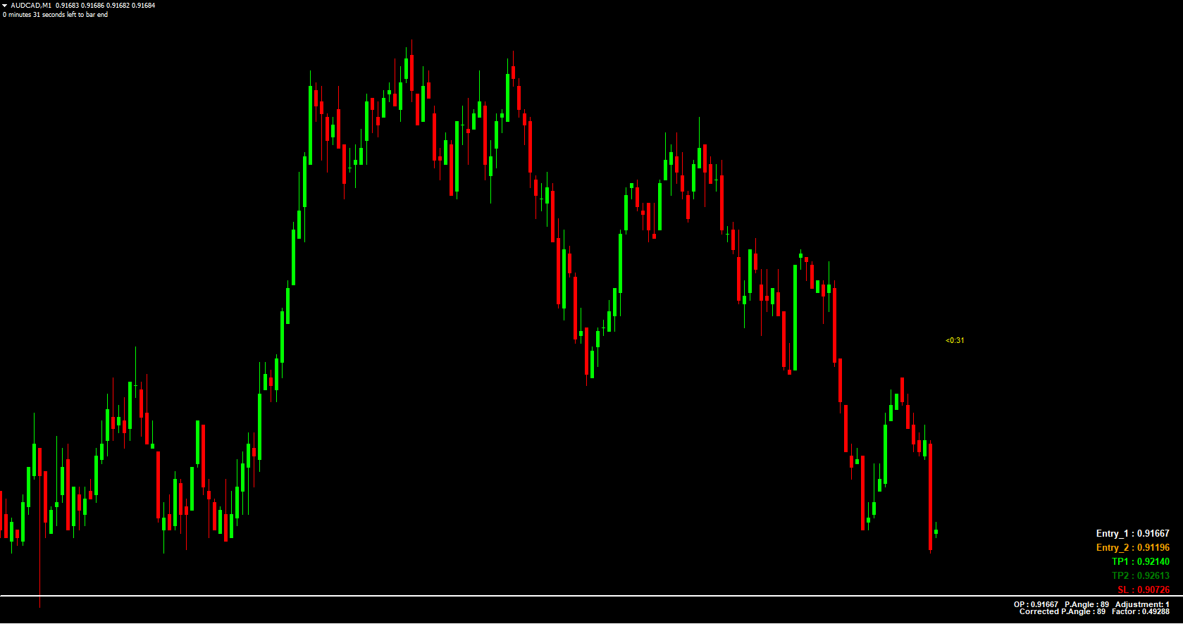 It calculates two entry points, two take-profit targets, and one stop-loss level, providing a complete trading framework with minimal guesswork.