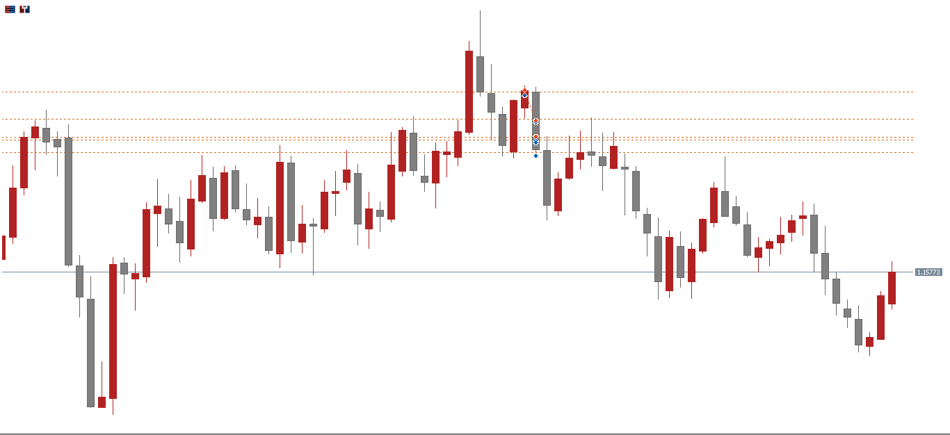 Sell Signal: When a red fractal appears above a candle, look for bearish confirmation (e.g., a lower low or bearish engulfing candle).
