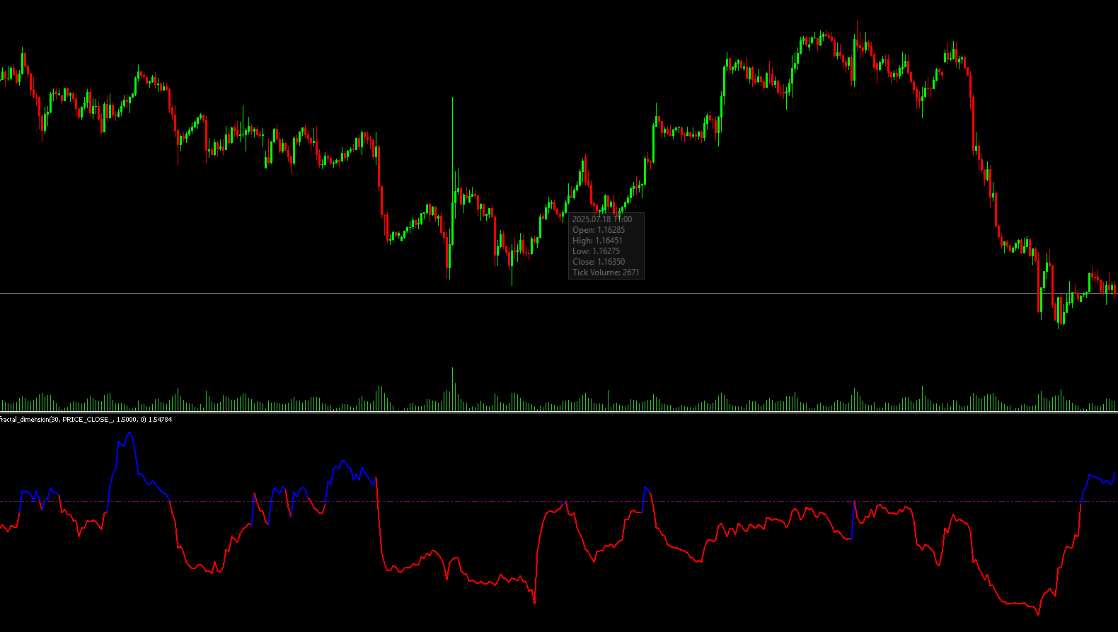 While the Fractal Dimension Indicator for MT5 does not generate direct buy or sell signals, it acts as a market condition filter. Traders can combine it with other tools—such as the Moving Average, RSI, or MACD—to confirm potential entries and exits.