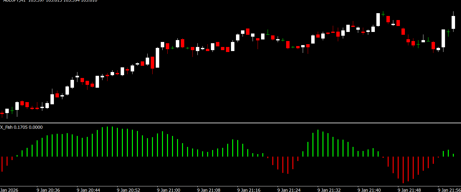 The FX Fish Indicator analyzes price data and applies the Fisher Transform algorithm to highlight market turning points. The indicator generates signals in a simple color-coded format: