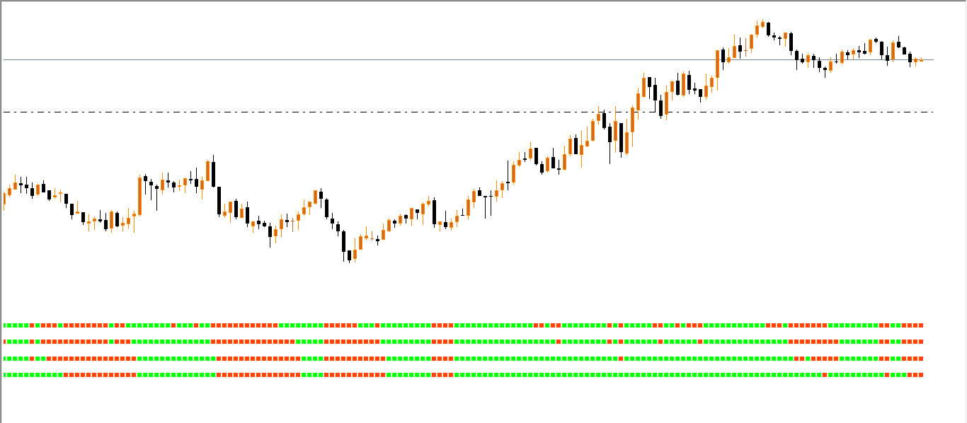 From a technical perspective, the FXDD Indicator helps traders understand market direction and momentum by plotting four rows of color-coded bars. Each row represents a 5-period moving average with slightly different parameters. This multi-layer approach allows traders to cross-check the trend bias and confirm the market’s strength.