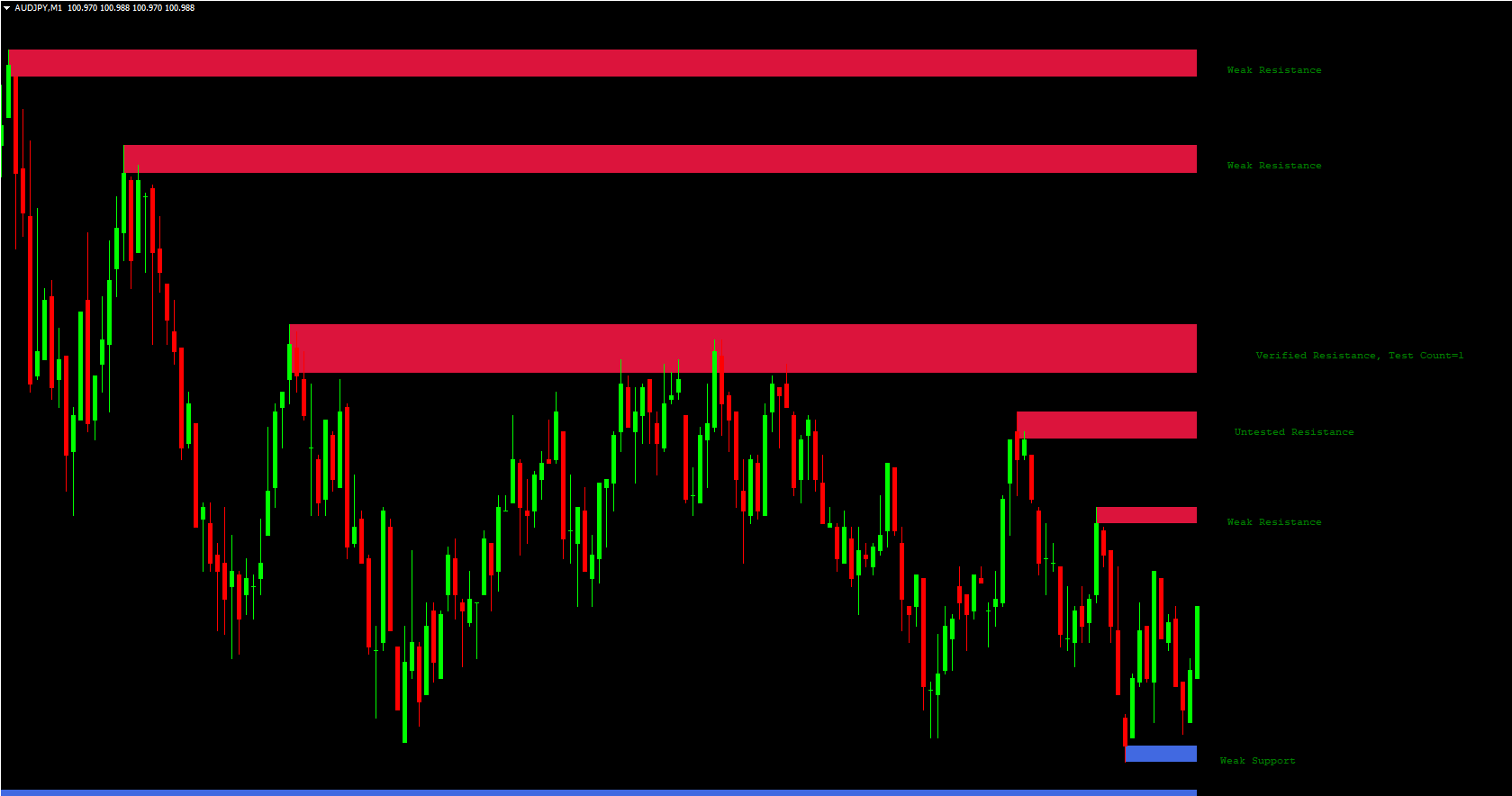 The FXR SR Zones Indicator categorizes levels into three types, giving traders deeper insight into price behavior: