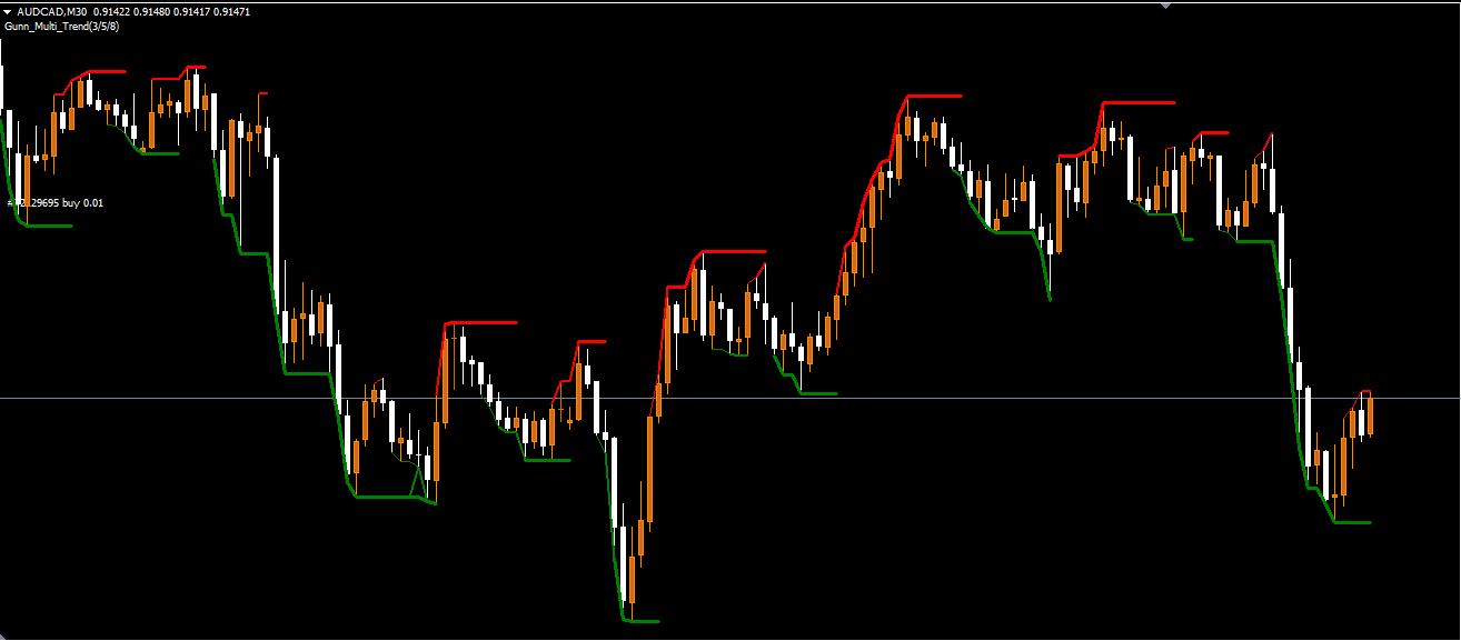 The Gann Multi Trend Indicator includes three separate trendlines, each with a unique sensitivity level: