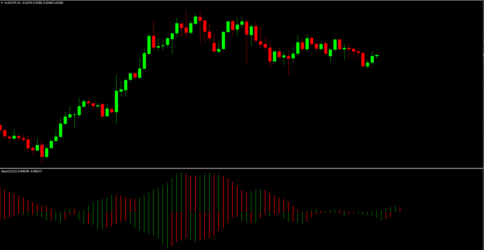 The Gator Oscillator plots two histograms—one above and one below the zero line. Each side changes color depending on the relationship between the Alligator’s moving averages. These colors help traders quickly spot trend phases and potential entry or exit points.