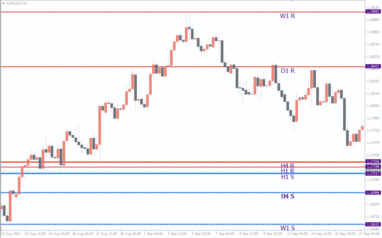 The EURUSD H4 chart example shows how the indicator plots key support and resistance levels automatically. Support levels appear in BLUE, while resistance levels appear in RED. The tool displays Hourly, H4, Daily, and Weekly levels simultaneously so traders always know where price is likely to react.